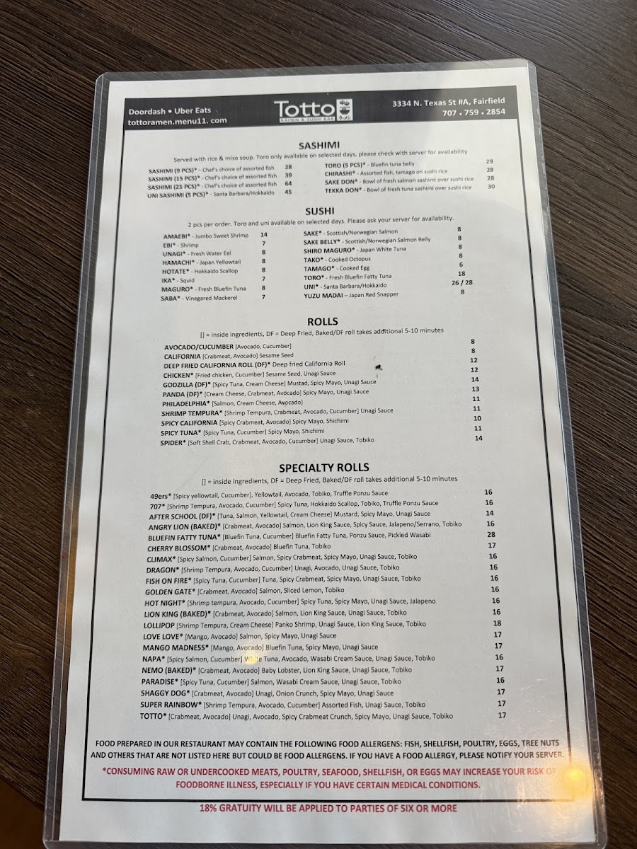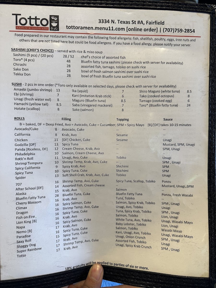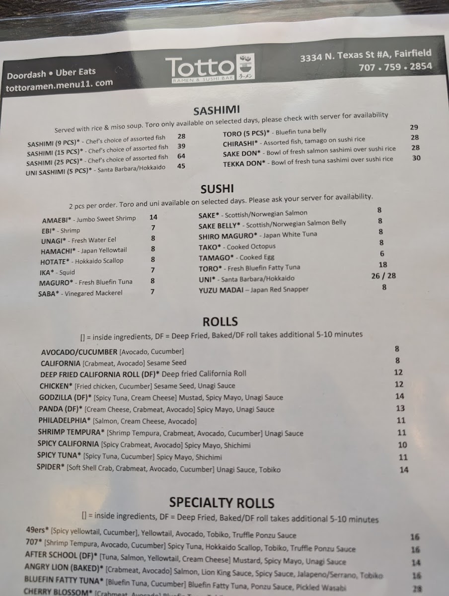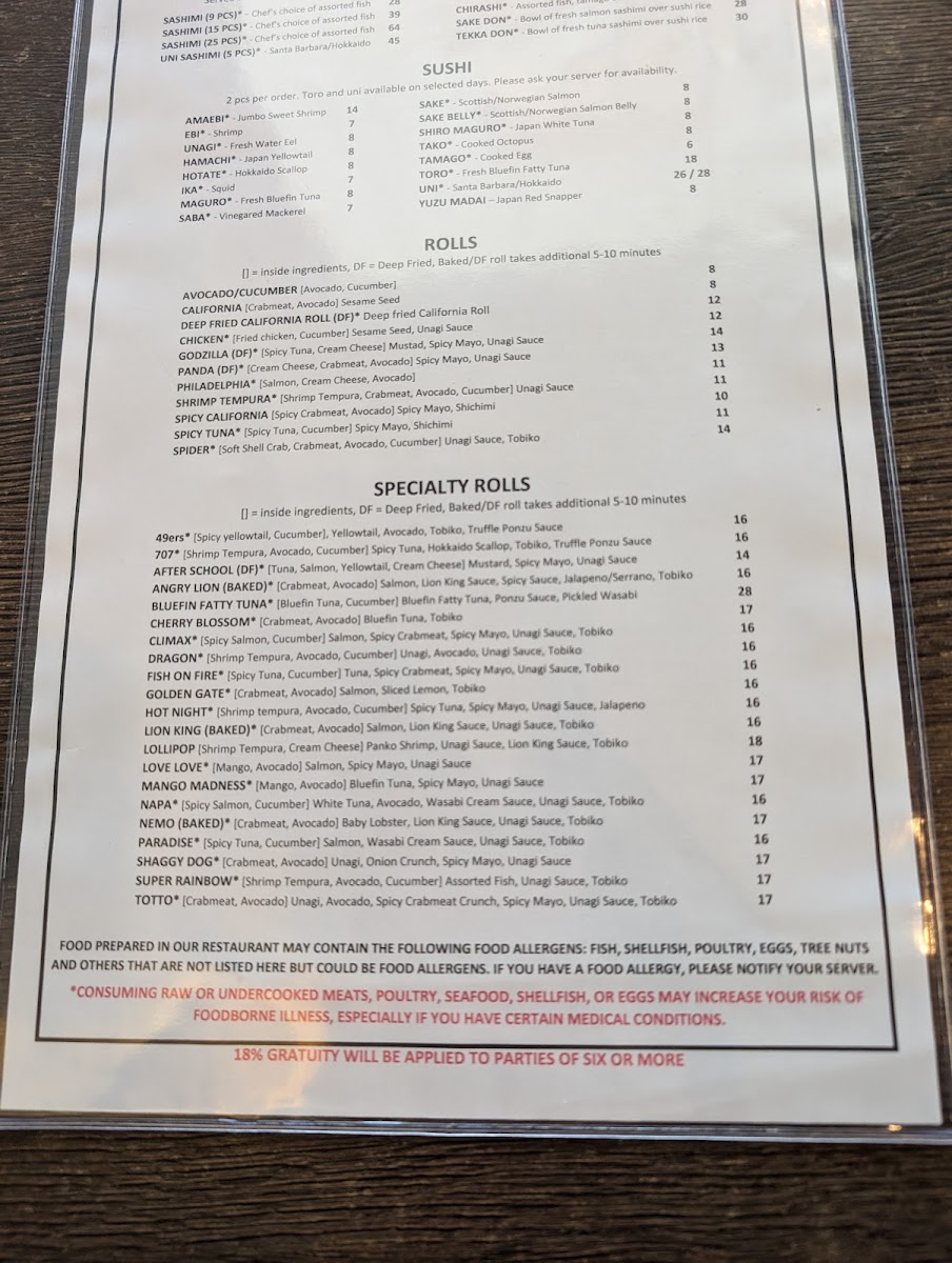 In: shrimp tempura, avocado, cucumber. Out: spicy tuna, hokkaido scallop, ponzu sauce, tobiko