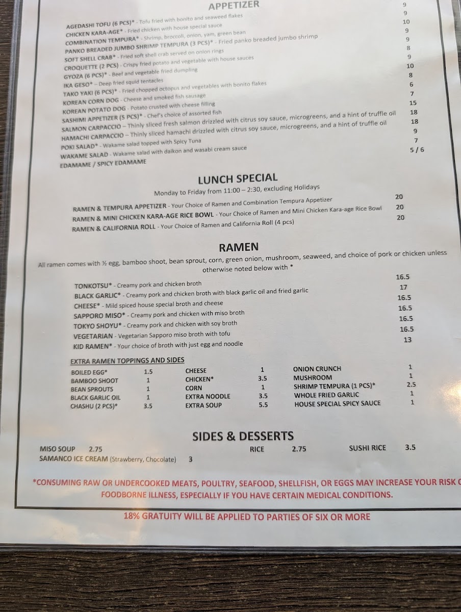 Your Choice of Ramen and Combination Tempura Appetizer All ramen comes with 1/2 egg, bamboo shoot, bean sprout, corn, green onion, mushroom, seaweed, and choice of pork or chicken.